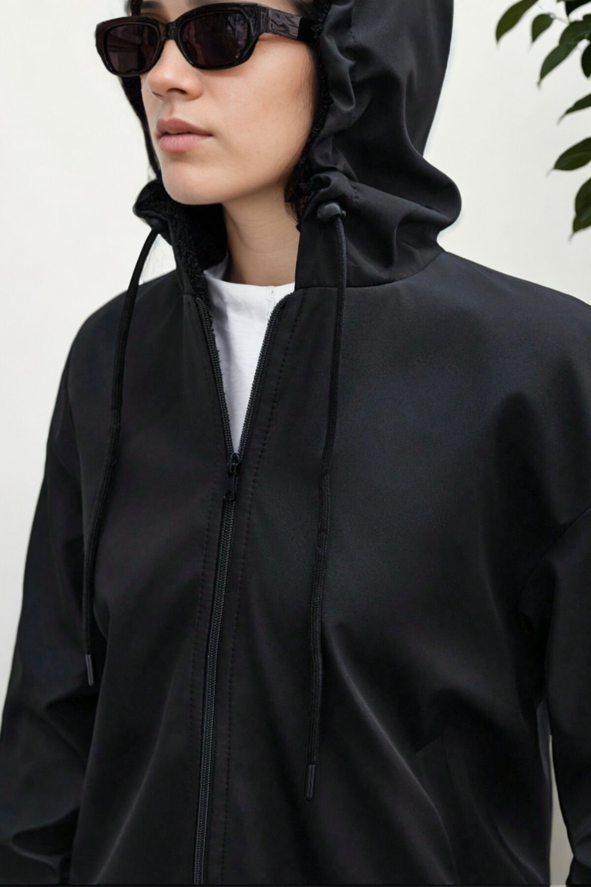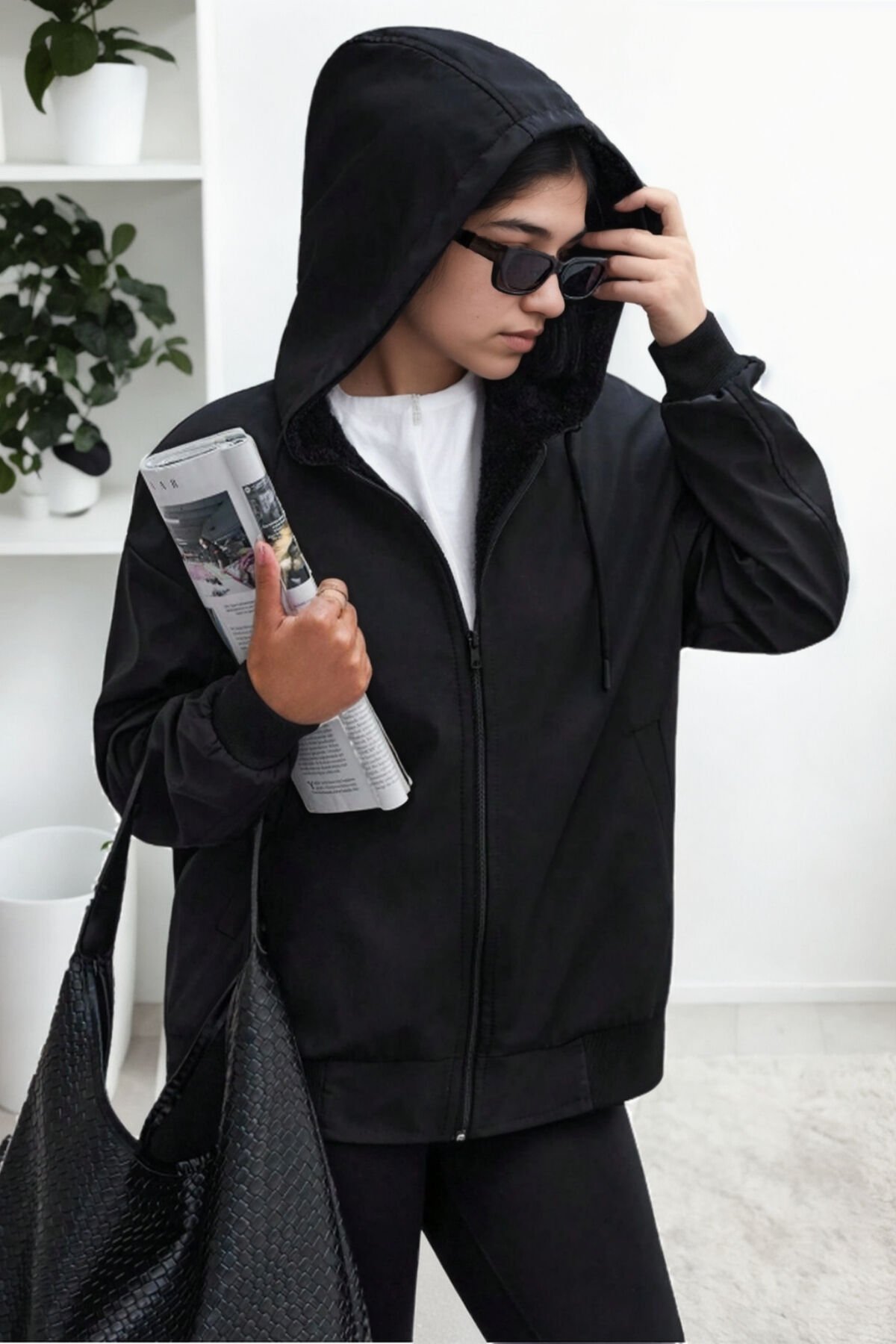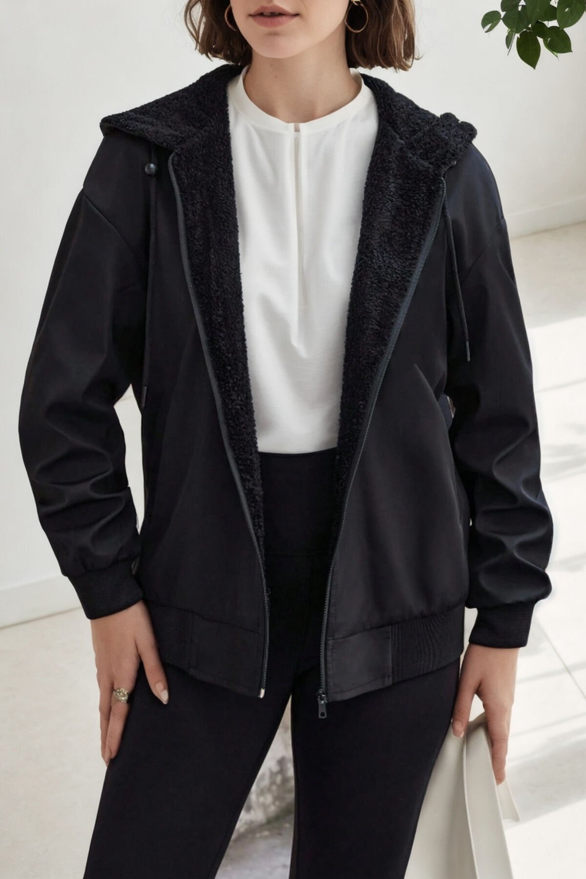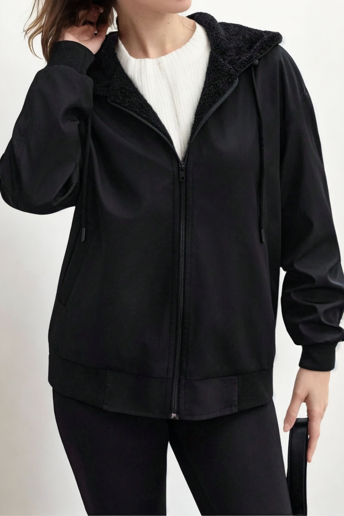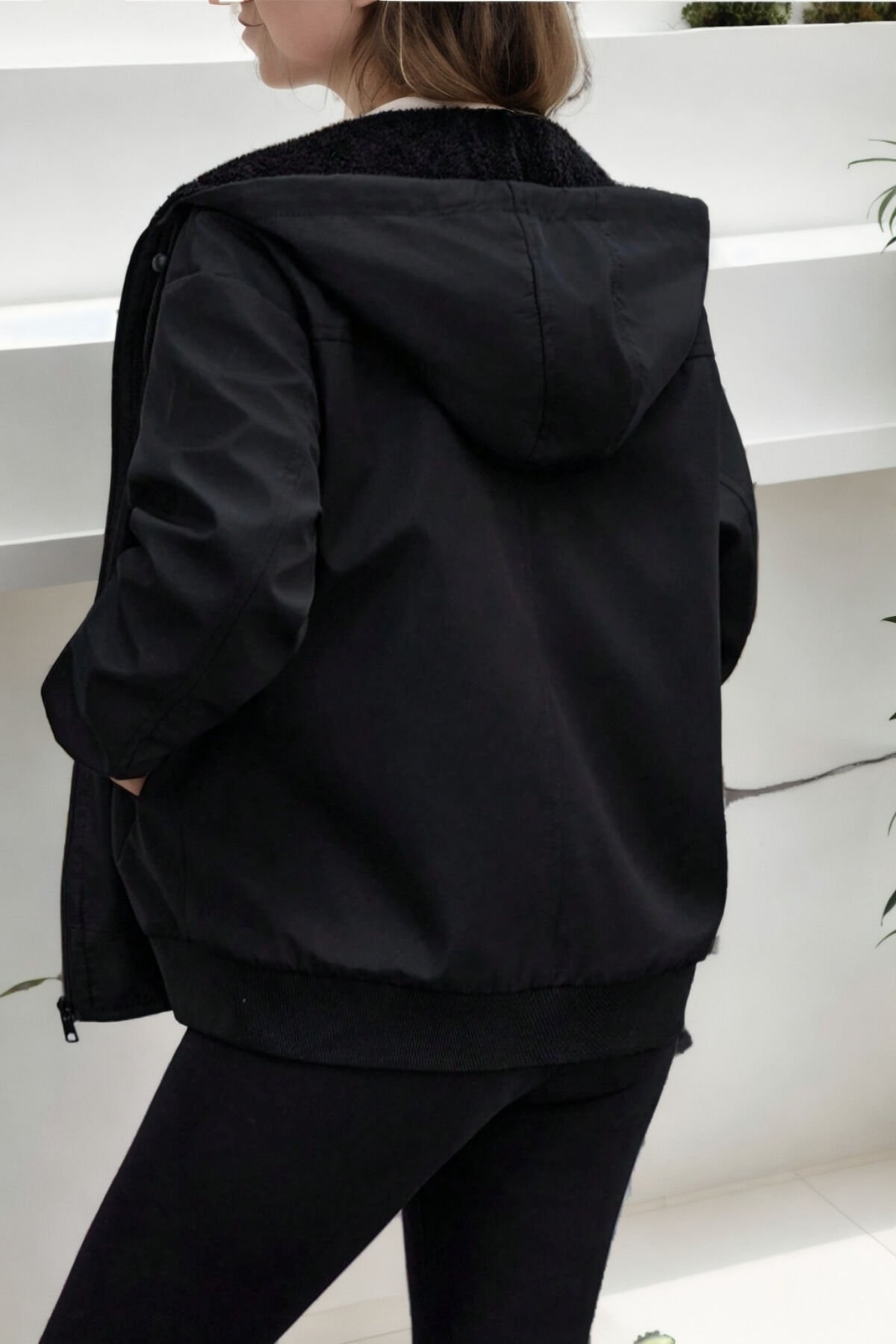 Oversize kısa fermuarlı kapüşonlu kürk astarlıdır
