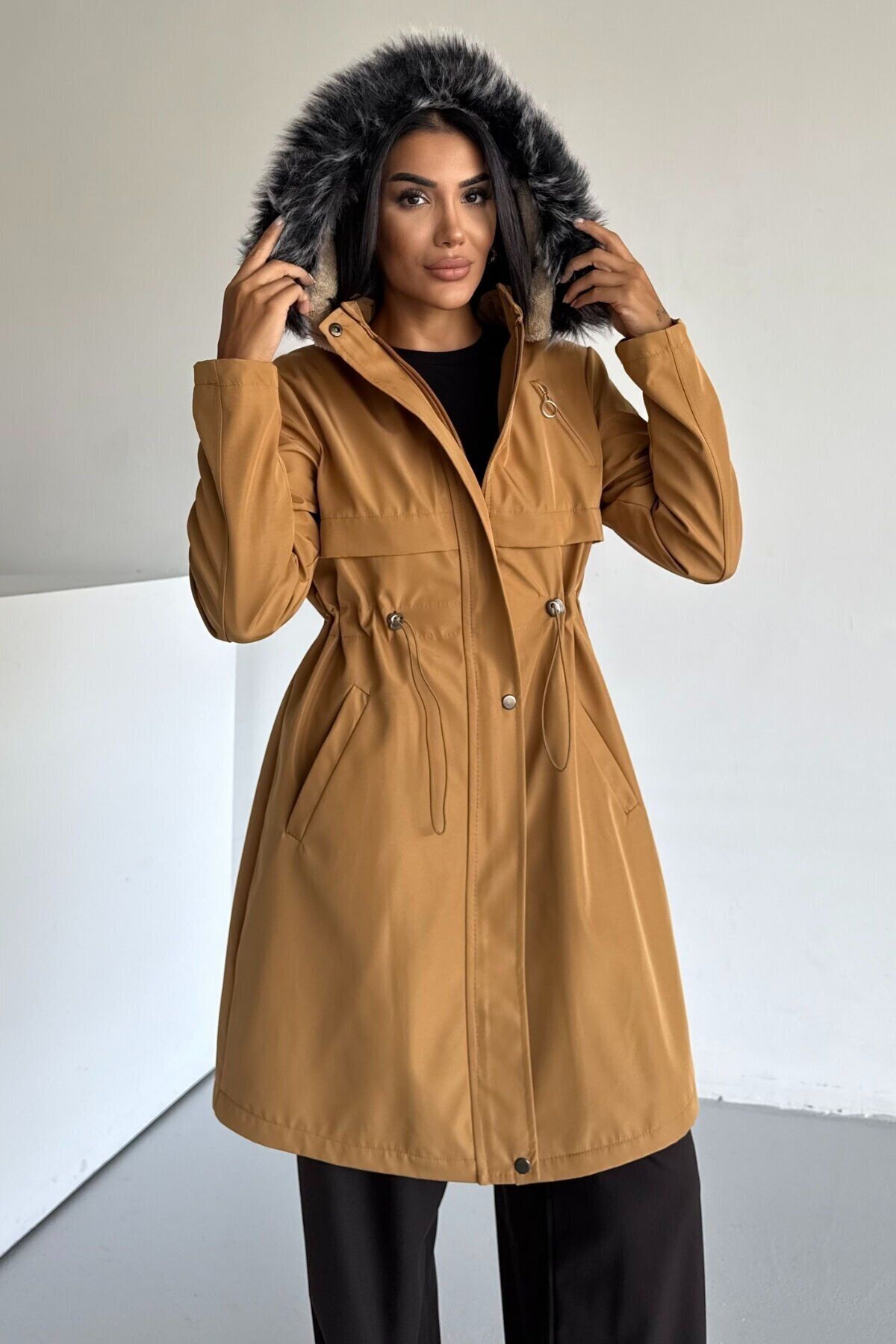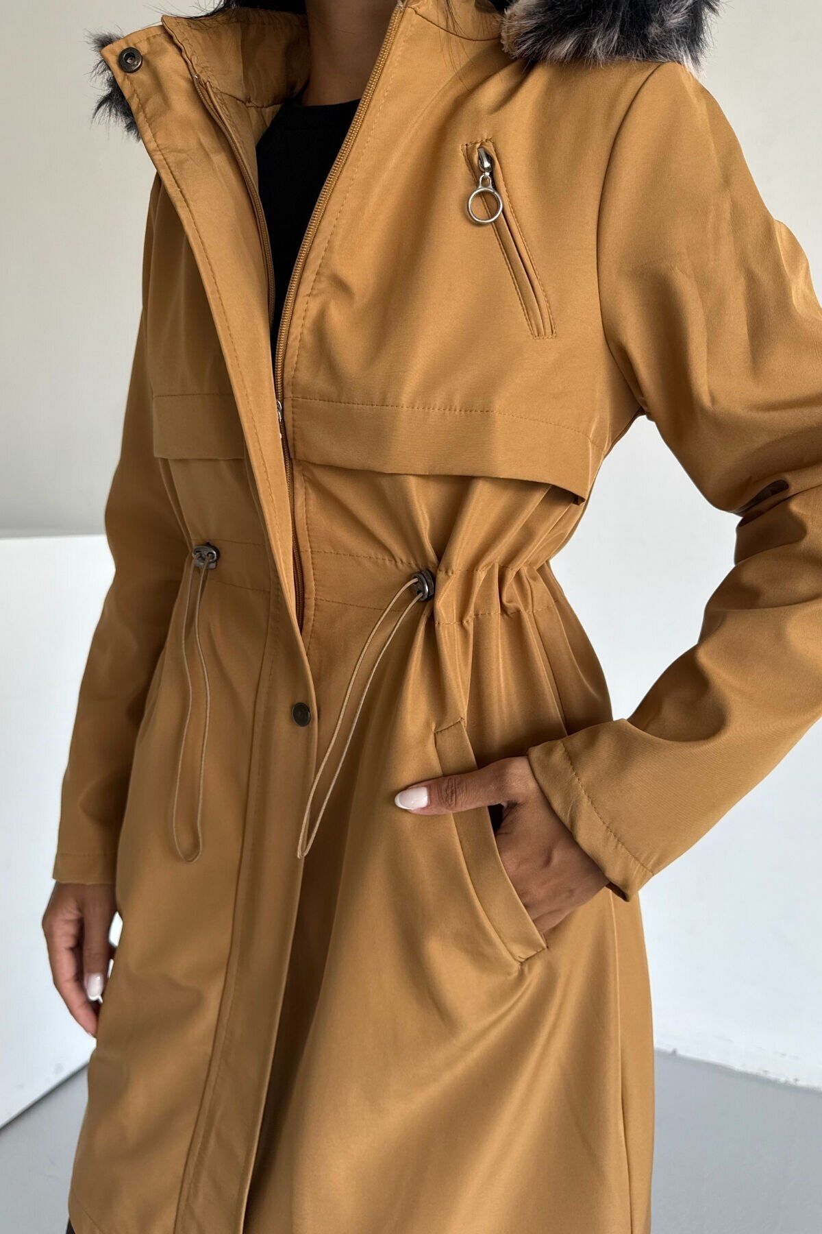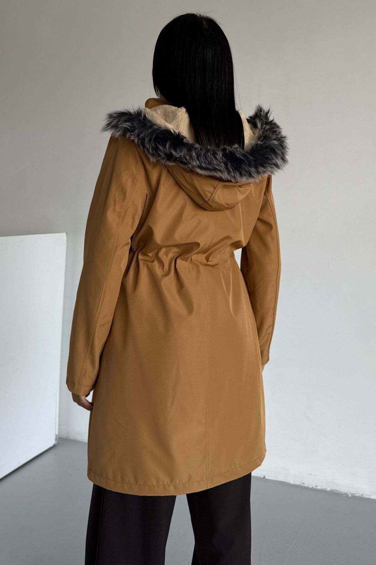 Bondit Kapüşonlu İçi Kürk Astarlı Fermuarlı Mont Taba KS2539 XS - Hardal KS2539KS2539HAR11