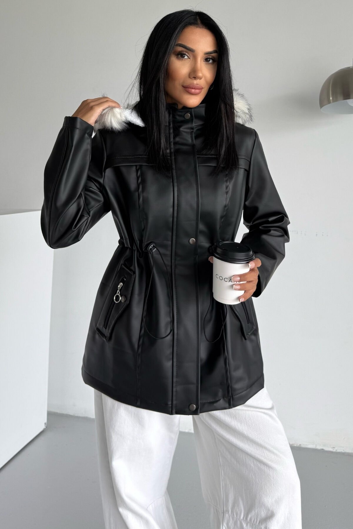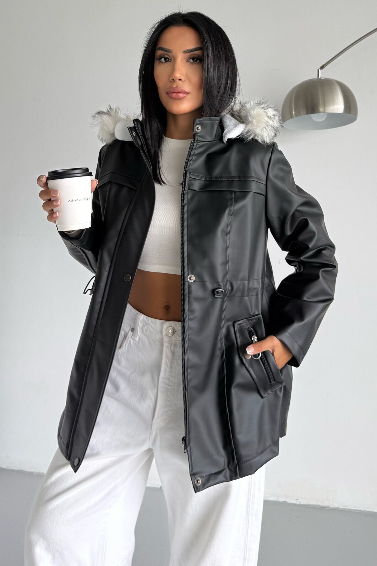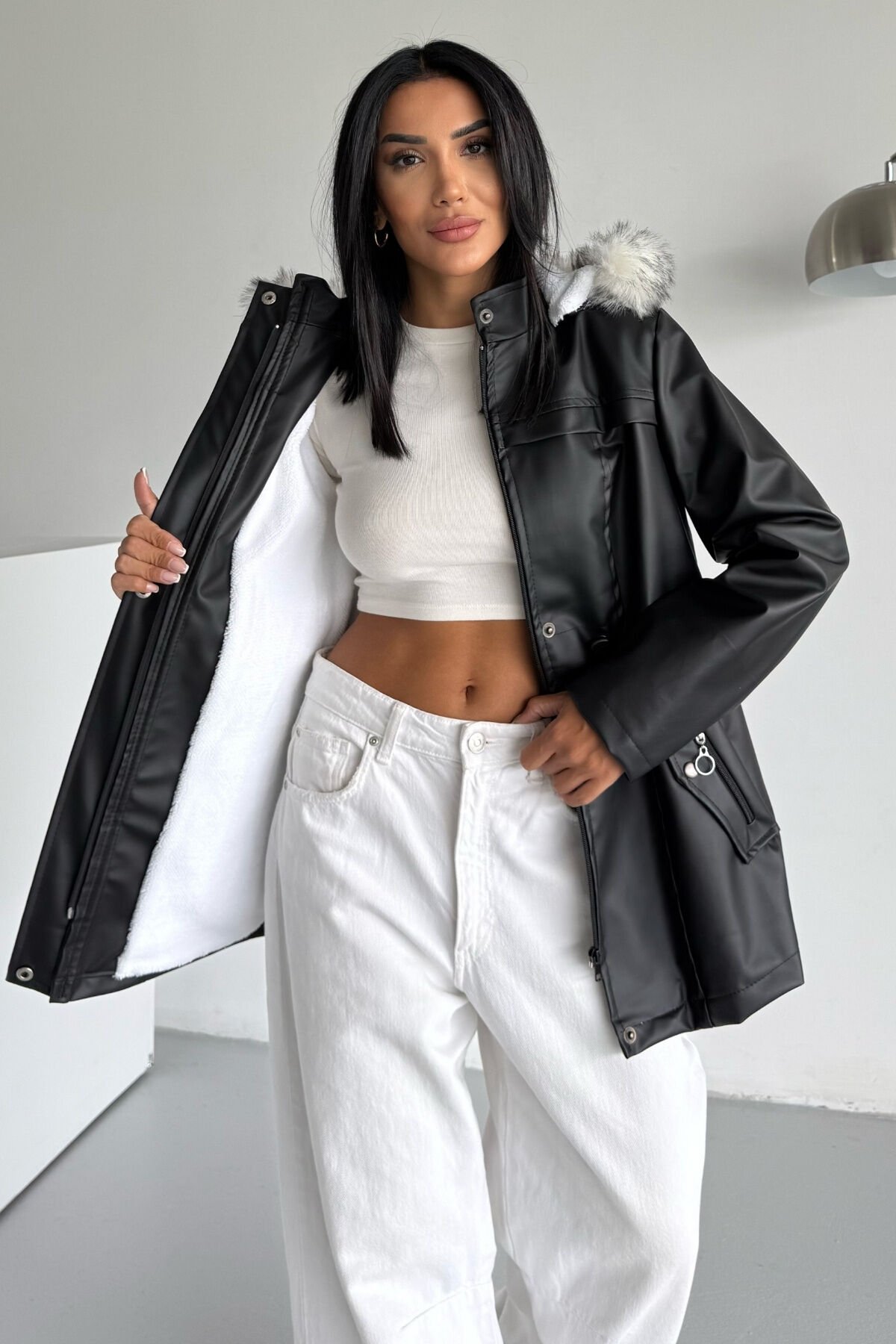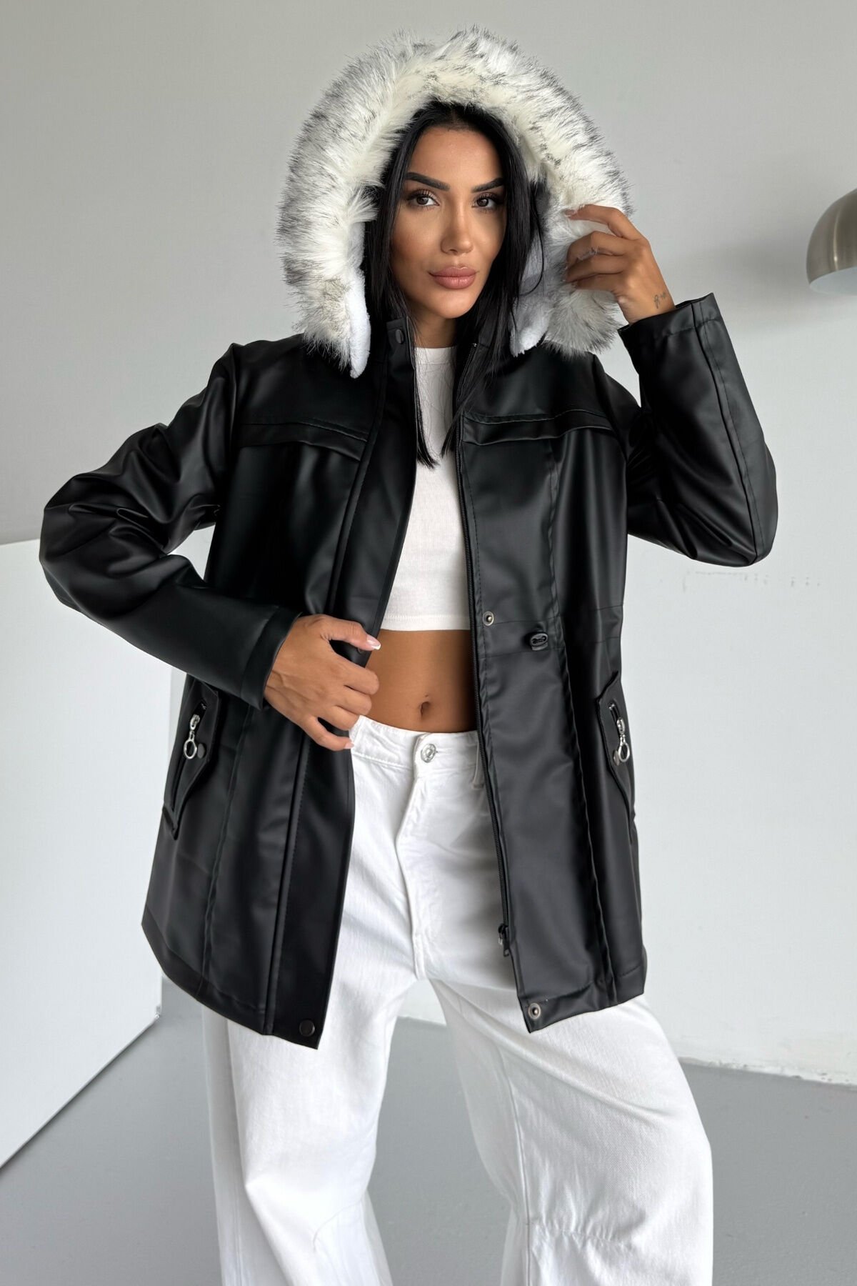 - Yetişkin ve genç kadınlar için tasarlanmış, şık ve rahat bir kışlık mont.; - İç kısmı kürklü kapüşonlu yapısıyla soğuk havalarda ekstra sıcaklık sağlar.; - Uzun kollu ve düz kesim tasarımı ile günlük kullanım için idealdir.; - Fermuarlı kapama şekli sayesinde kolay giyilip çıkartılabilir ve pratik bir kullanım sunar.; - Astarlı yapısı ile konforlu bir iç yapıya sahiptir.; - Çift cepli tasarımı küçük eşyalarınızı yanınızda taşımanız için kolaylık sağlar.; - Kapüşonlu yaka tipi başınızı soğuktan korurken şıklığınızdan ödün vermez.; - Kalın dokusu ile kış aylarında sizi sıcak tutar.; - Siyah rengi ve düz deseniyle kolayca kombinlenebilir; her tür kıyafetle uyum sağlar.; - Suni deri materyali hem dayanıklılık hem de estetik bir görünüm kazandırır.; - Kürk yaka detayı ile sofistike bir dokunuş ekler.; - Deri içi kürklü yapısı ile soğuk havalarda sıcak tutar ve konfor sağlar.; - Kapüşonlu tasarımı sayesinde baş ve boyun bölgesini korurken şık bir görünüm sunar.; - Siyah rengiyle kolayca kombinlenebilir ve her ortamda stil sahibi bir duruş sergiler.; - Uzun kollu yapısı, kollarınızın tamamını sararak ekstra koruma ve rahatlık sağlar.; - Çift cepli tasarım pratik kullanım imkanı tanırken küçük eşyalarınızı güvenle taşımanızı mümkün kılar.; - Suni deri dokuması dayanıklılığı artırırken modern bir görünüm kazandırır.; - Type 2 yıkama talimatına uygun şekilde temizlenmesi ürün ömrünü uzatır.; - S bedeni ile vücuda oturan ancak sıkıştırmayan ideal kalıba sahiptir.