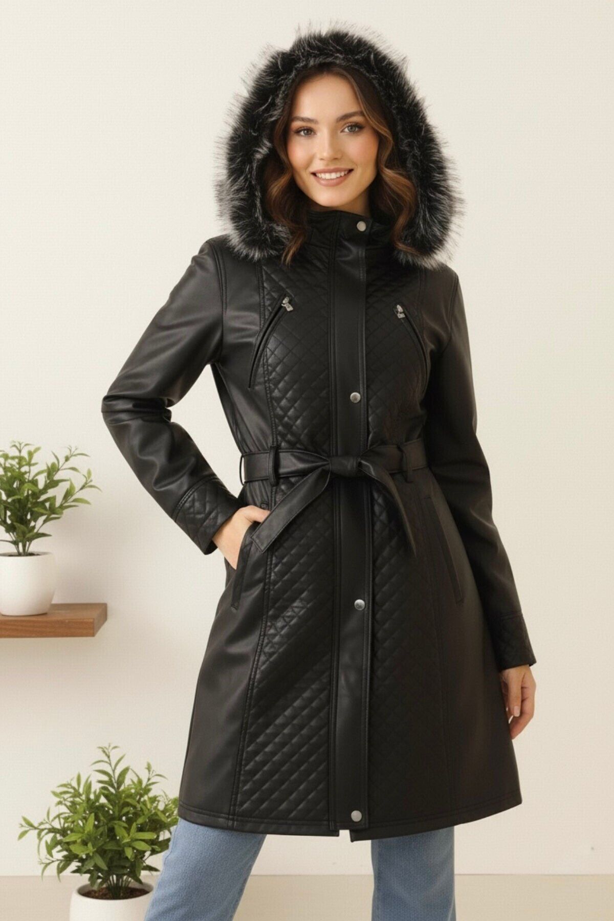 - Yeni sezonun trendlerini yansıtan deri kapüşonlu polar astarlı kadın montu, şıklığı ve konforu bir arada sunar.; - Uzun boy tasarımı ile hem günlük kullanımda hem de özel günlerde rahatlıkla tercih edilebilir.; - Suni deri kumaşı, dayanıklılığı ve modern görünümüyle dikkat çeker.; - Yetişkin kadınlar için ideal olan bu mont, regular kalıbıyla vücut hatlarını saran bir yapıya sahiptir.; - Astarlı yapısı sayesinde soğuk havalarda ekstra sıcaklık ve konfor sağlar.; - Düz kesimiyle sade ve şık bir görünüm sunarken, siyah rengi her türlü kombinle uyum sağlar.; - Rüzgar geçirmez özelliği ile kötü hava koşullarına karşı koruma sağlar.; - Çift cepli tasarımı küçük eşyalarınızı güvenle taşımanız için idealdir.; - Kapüşonlu yaka tipi baş ve boyun bölgesini soğuktan korurken, kemer detayları bel bölgesine şık bir vurgu yapar.; - Fermuar ve çıt çıt kapama şekli kolay kullanım imkanı sunarken, su itici teknoloji ile yağmur ve kar gibi olumsuz hava koşullarına karşı direnç gösterir.