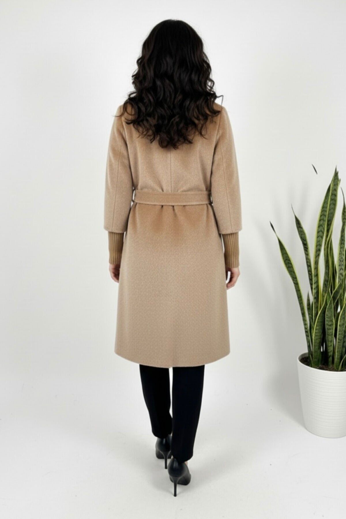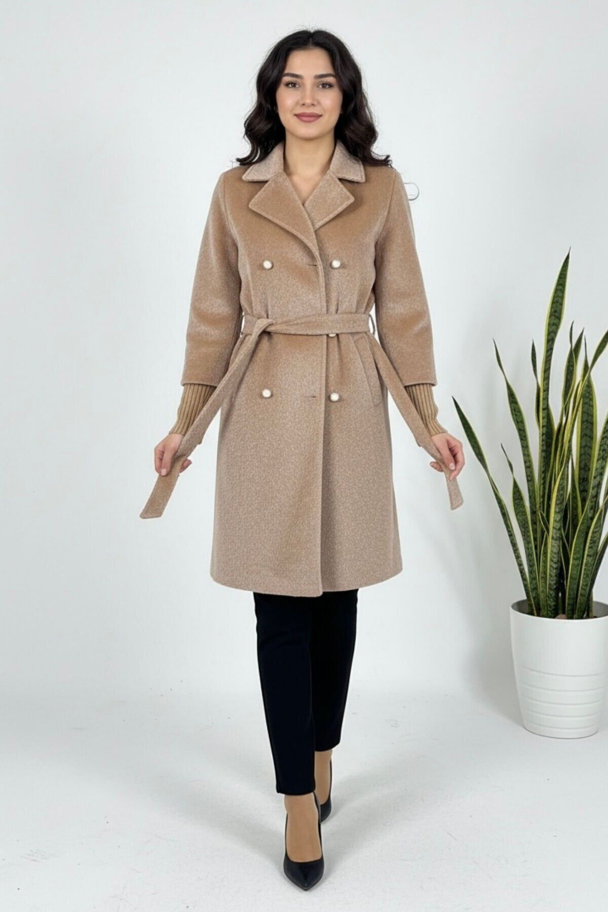 Kadın Yeni Sezon Belden Bağlamalı Fox Kumaş Kaban Vizon KS2550 40 - Vizon