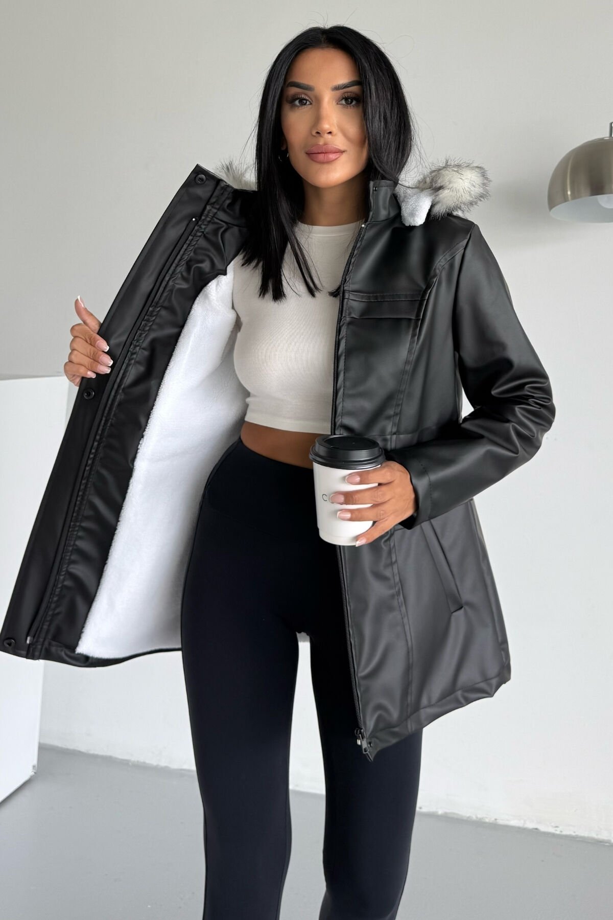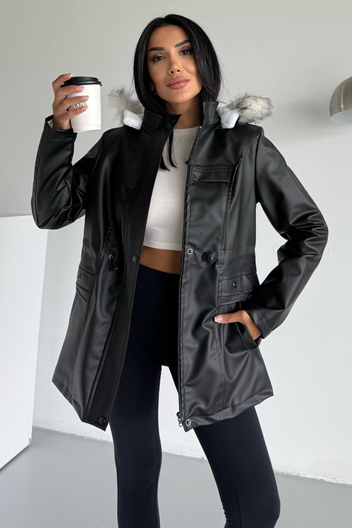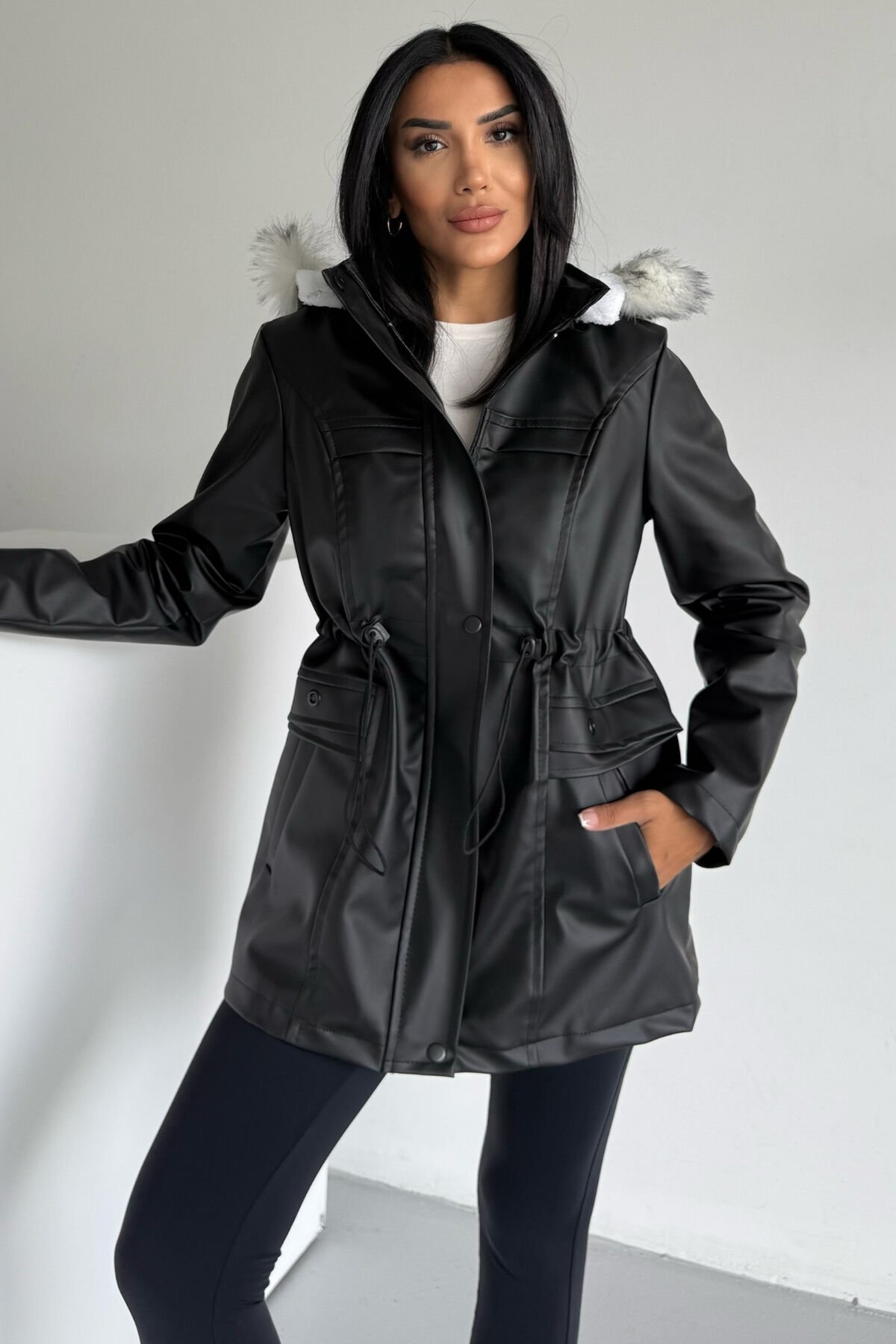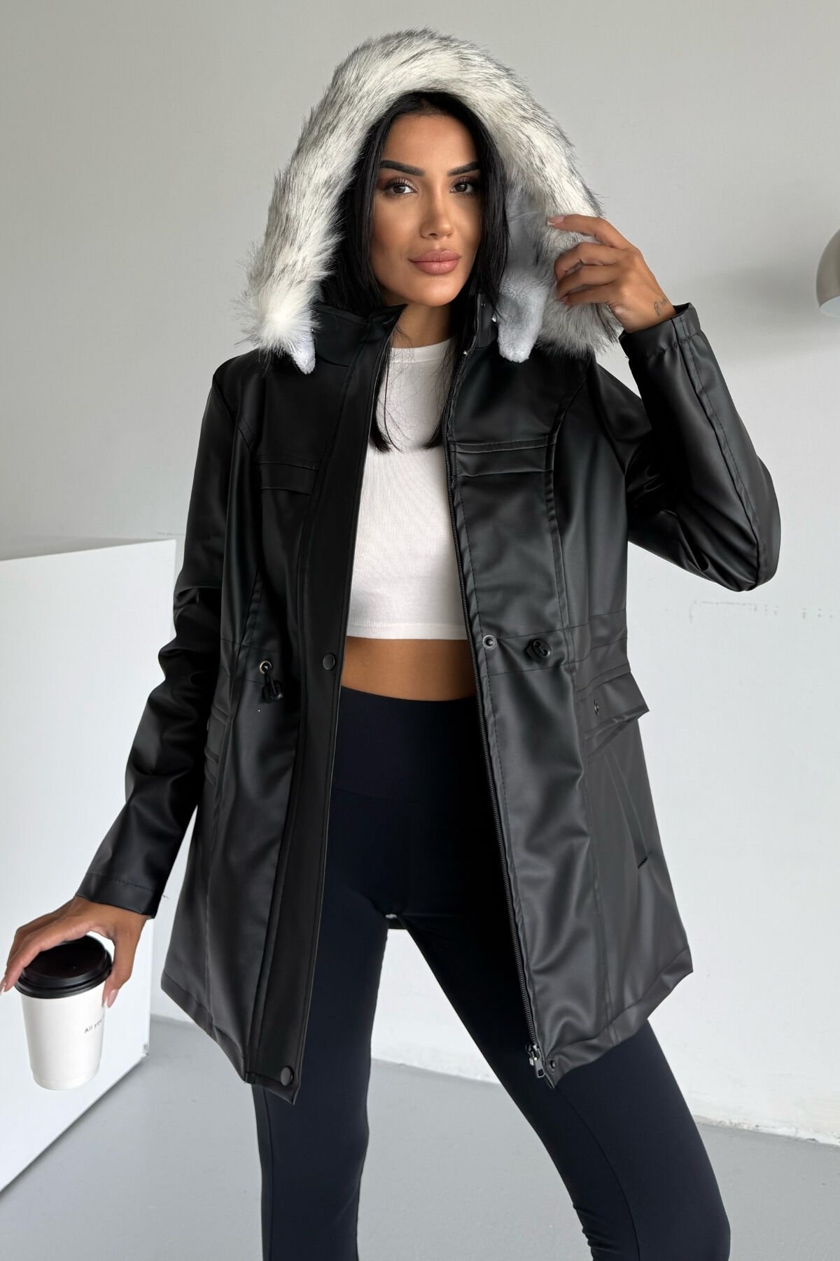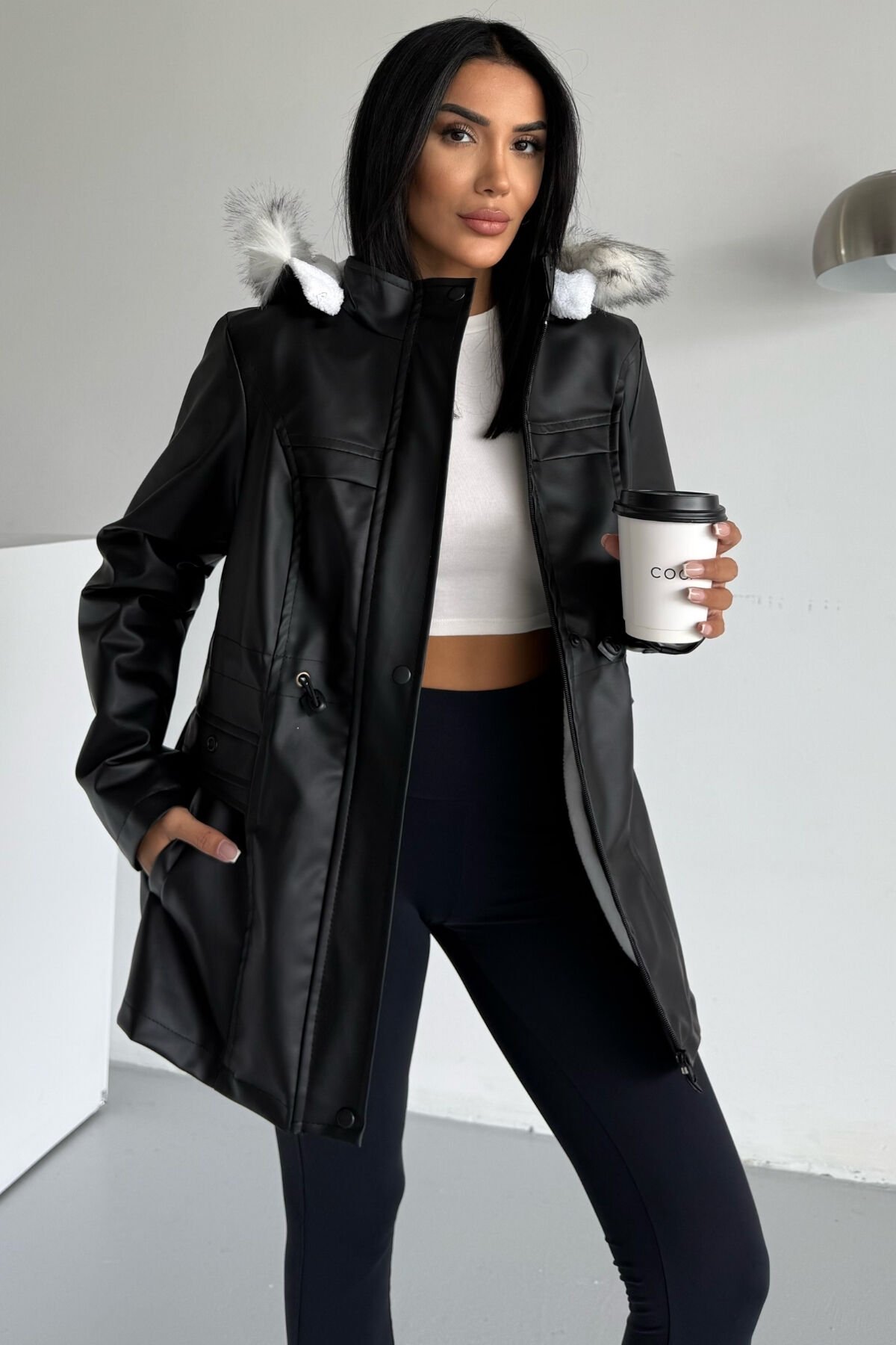 Kapüşonlu Suni Deri İçi Kürklü Cep Üstü Detaylı Mont KS2509