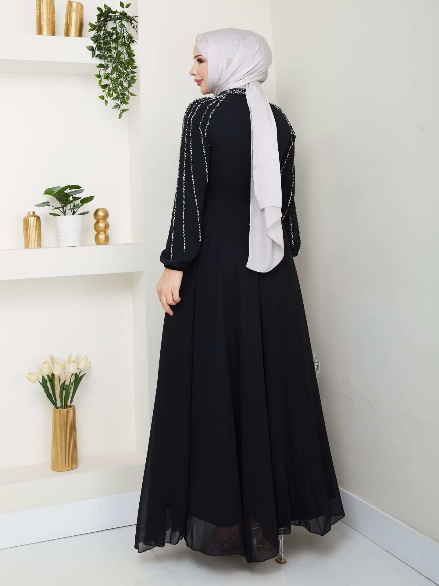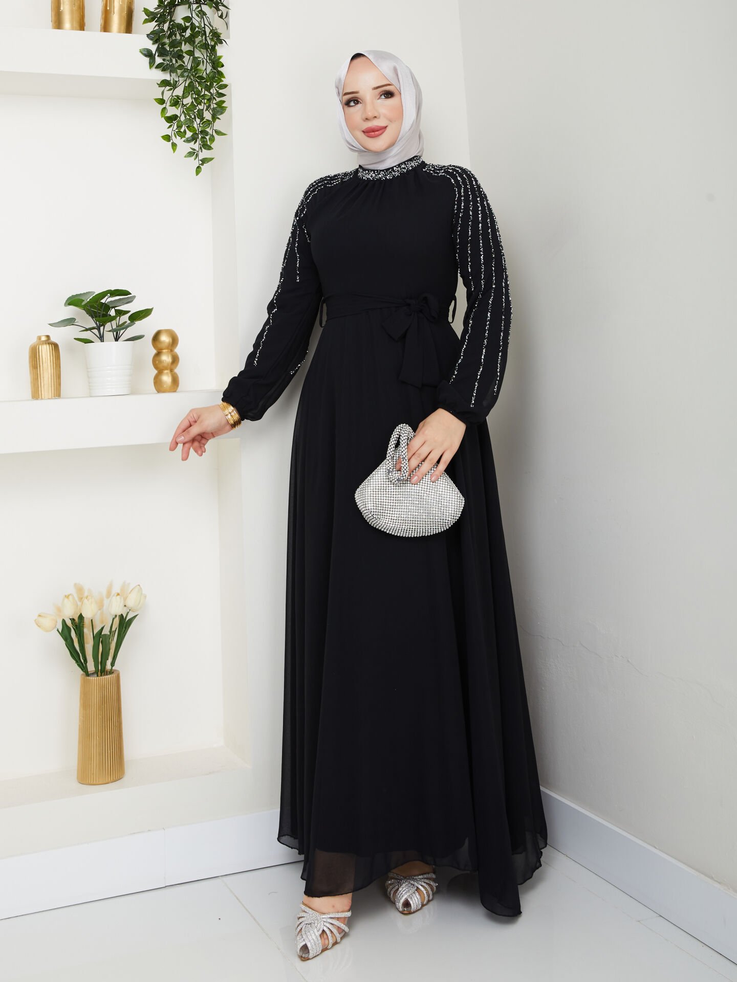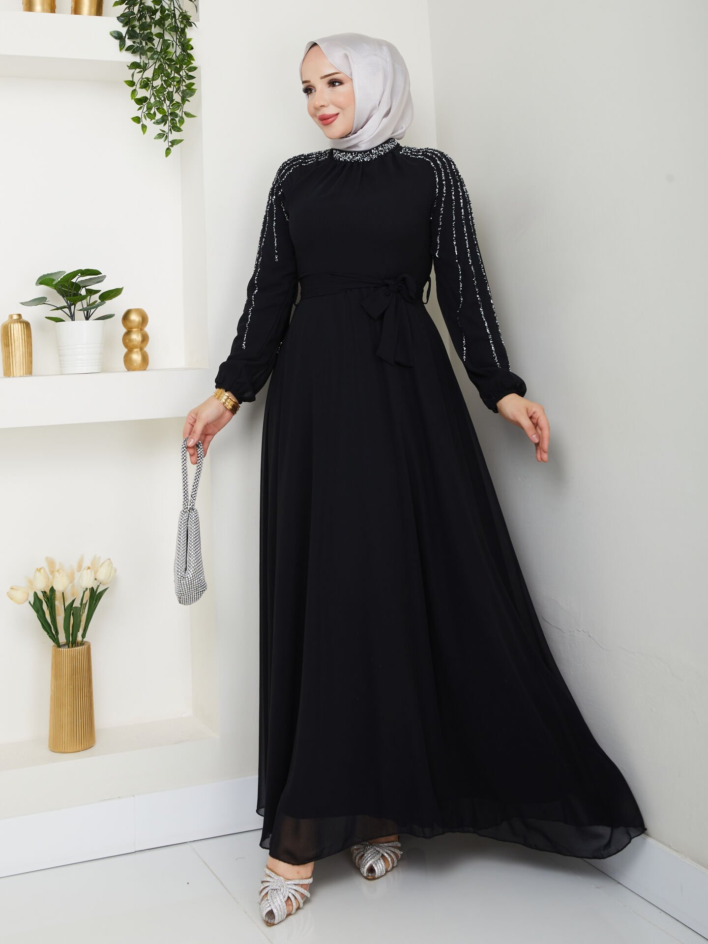 Göz alıcı şifon elbise, zarif tasarımı ve dikkat çekici taş süslemeleriyle her türlü özel etkinlik için mükemmel bir seçenektir. İnce astarı ve hafif kumaşı sayesinde rahat bir kullanım sunarken, kol detaylarıyla da şıklığı ön plana çıkarır. Bu elbise, tarzınızı ve zarafetinizi vurgulamak istediğiniz her an için ideal bir seçimdir.