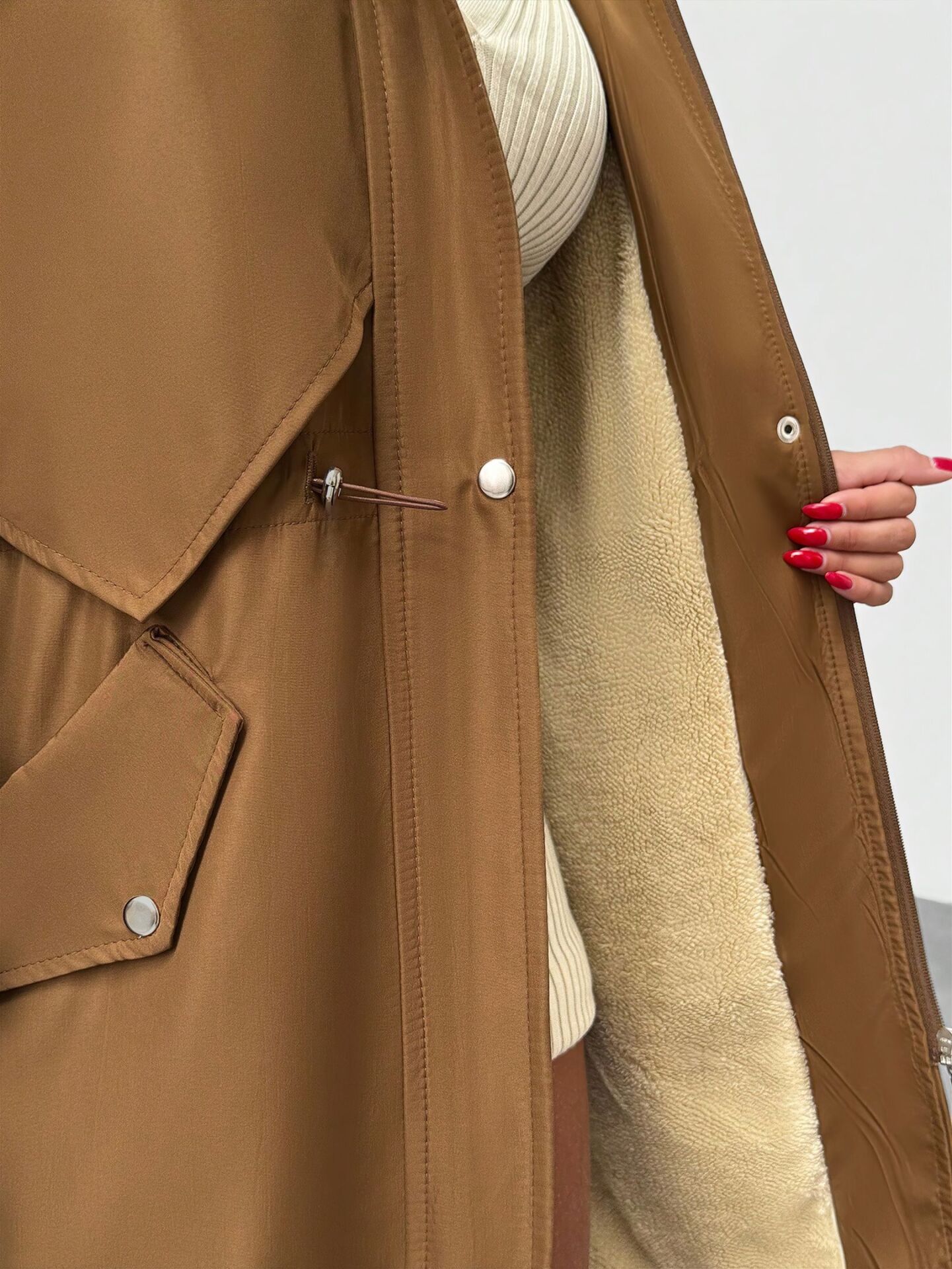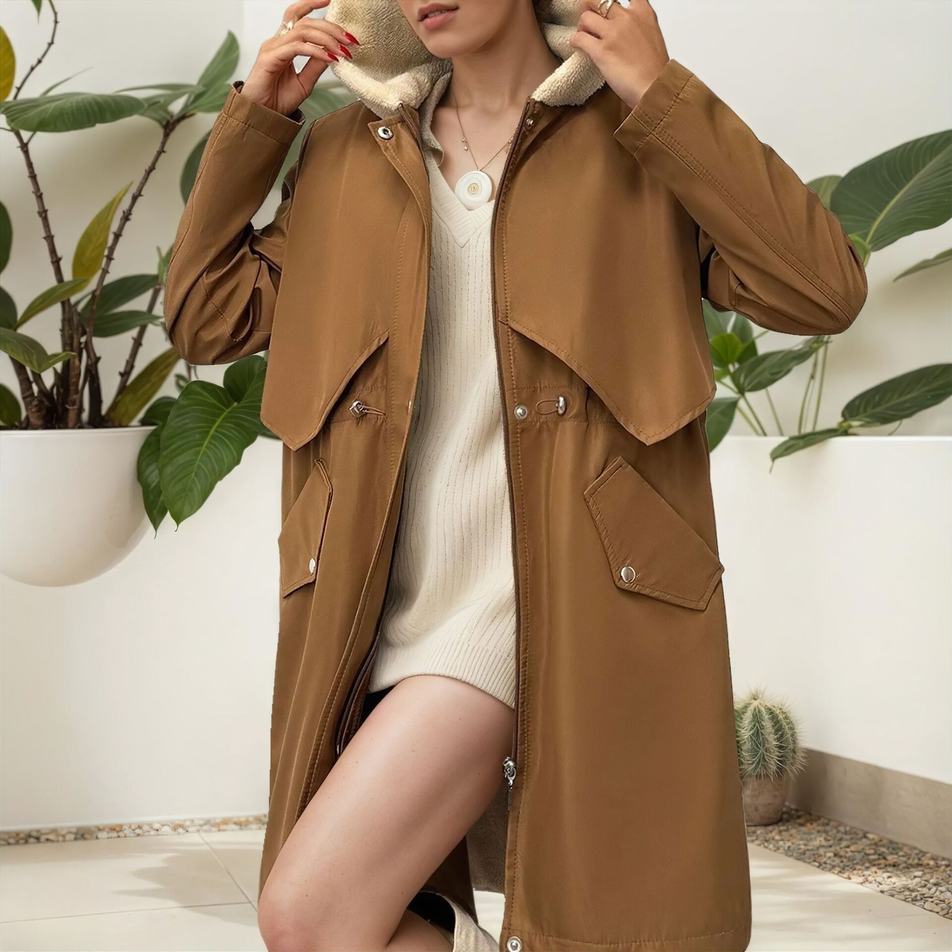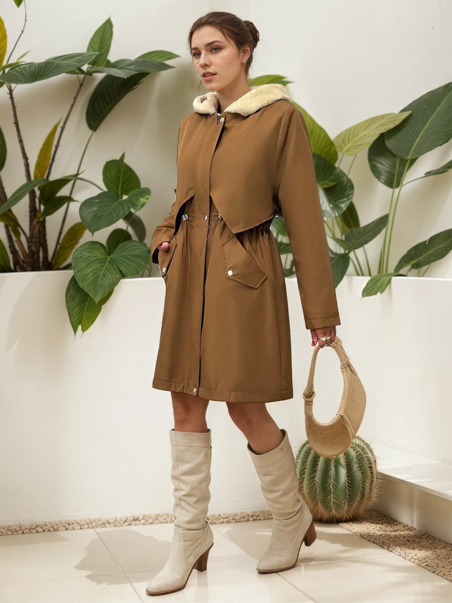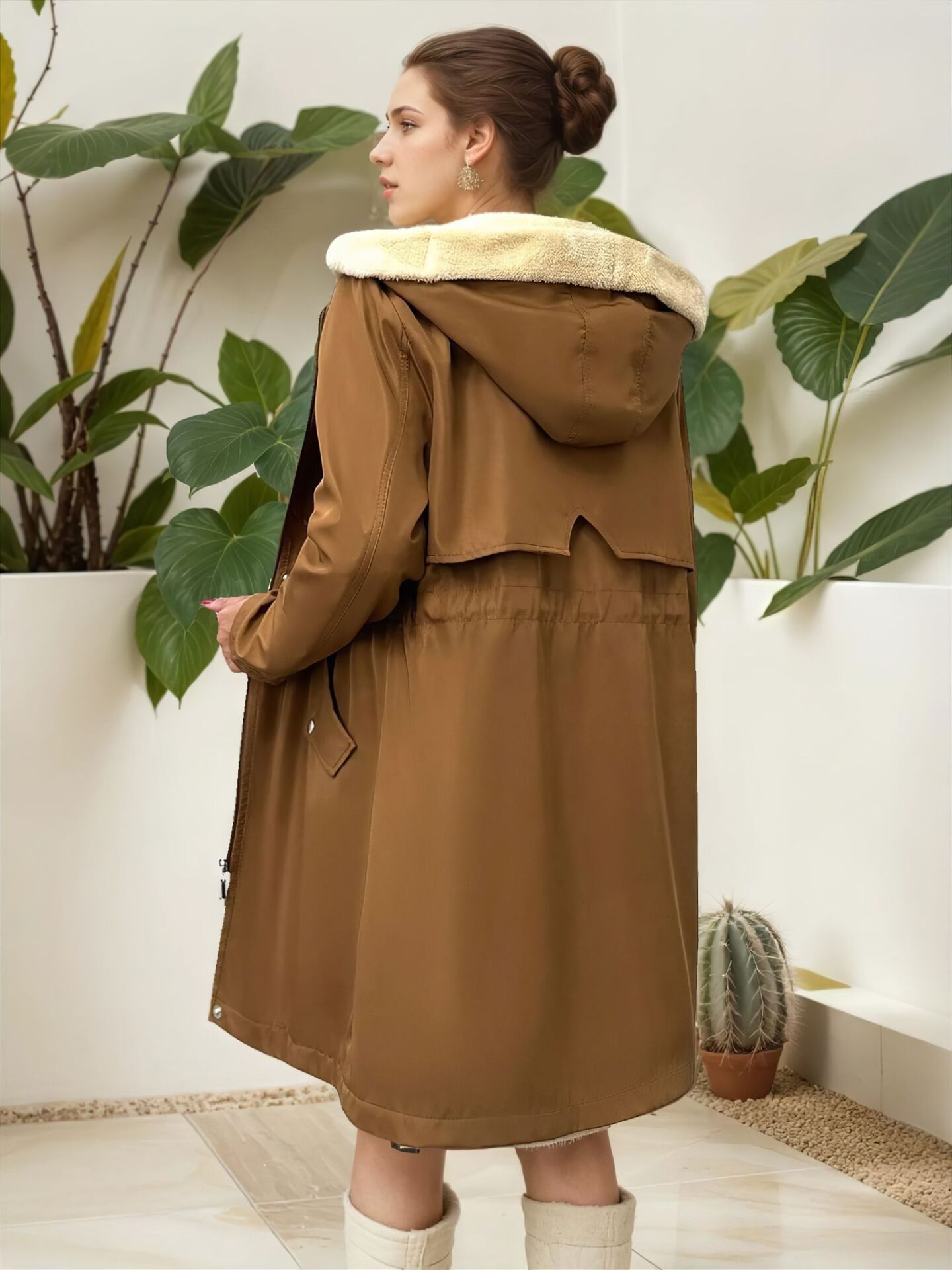 Kürk Astarlı Kapüşonlu Bel Büzgülü Mont