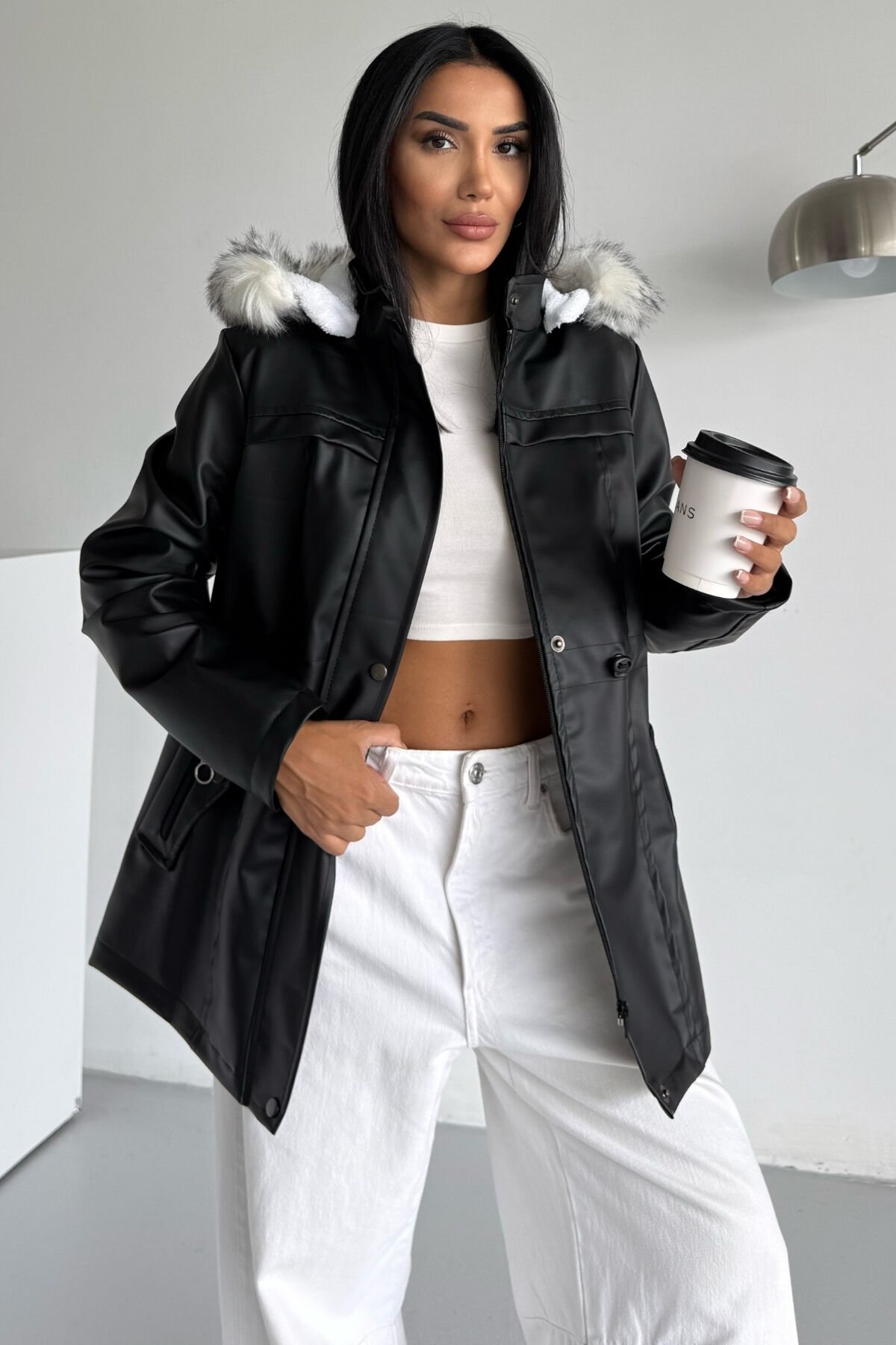 Deri İçi Kürklü Kapüşonlu Mont KS2508