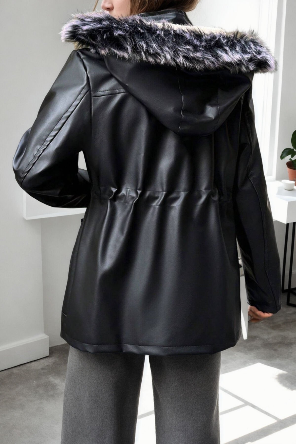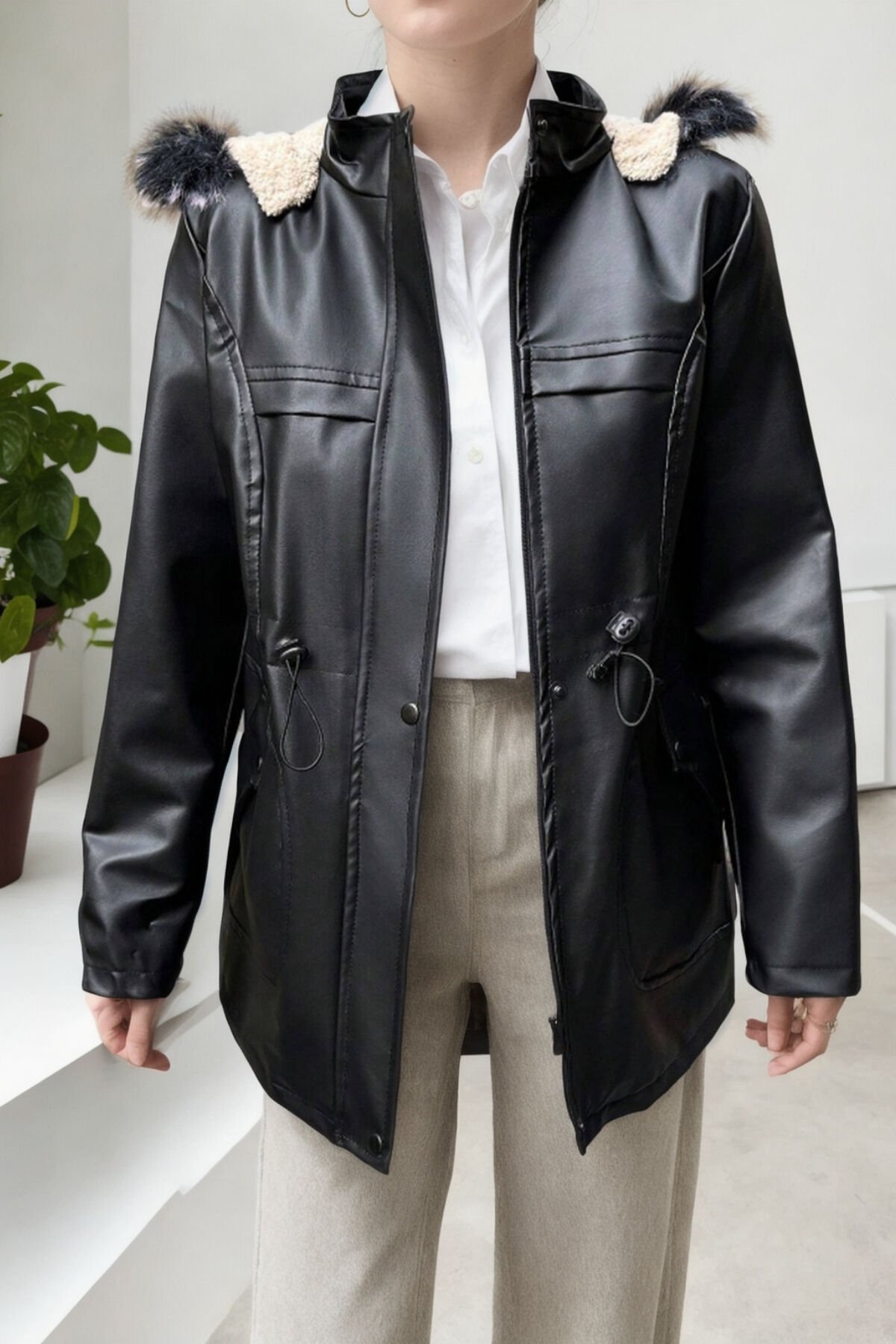 Suni Deri Kapüşonlu Bondik Cep Kapak Detaylı Mont