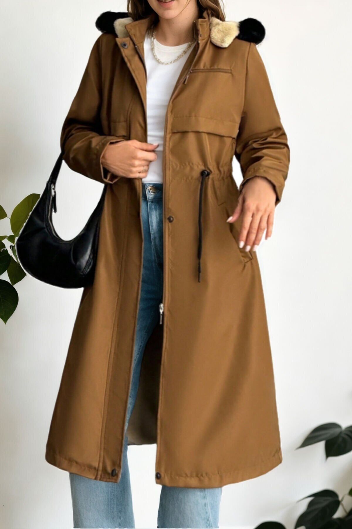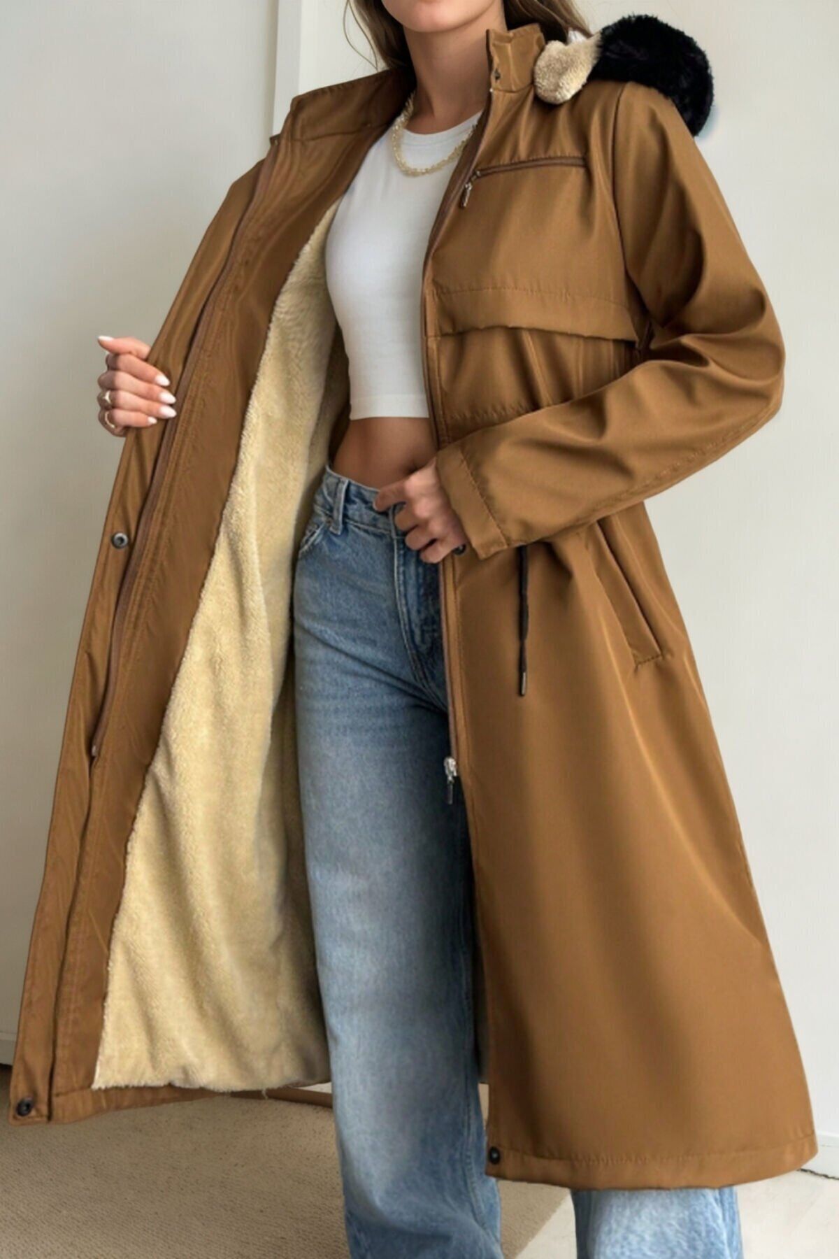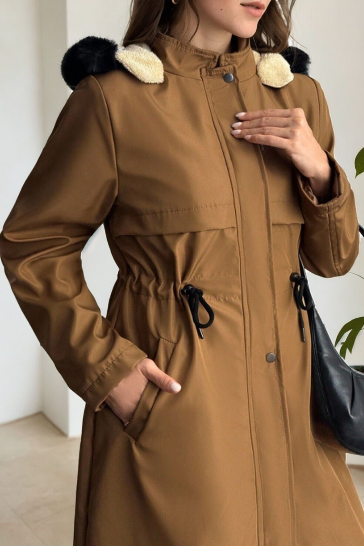 Uzun İçi Kürk Astarlı Bondit Kapüşonlu Kaban Taba KS2523 S - Taba