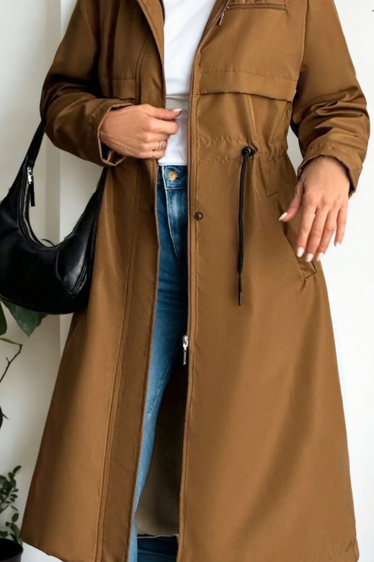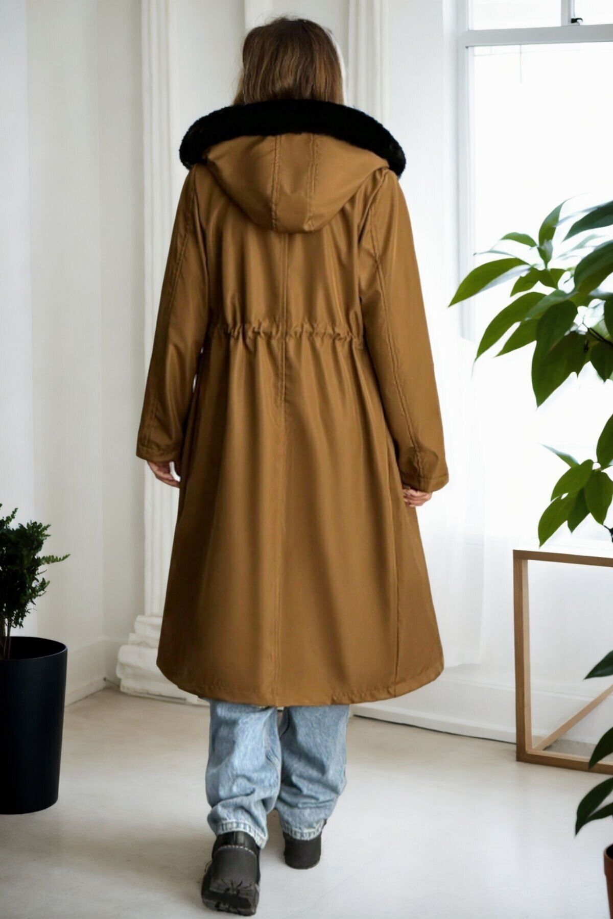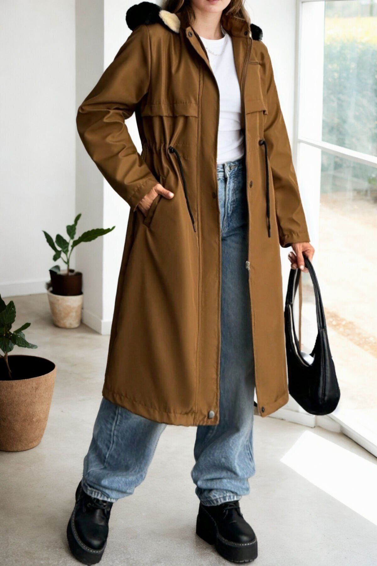 Uzun İçi Kürk Astarlı Bondit Kapüşonlu Kaban Taba KS2523 S - Taba