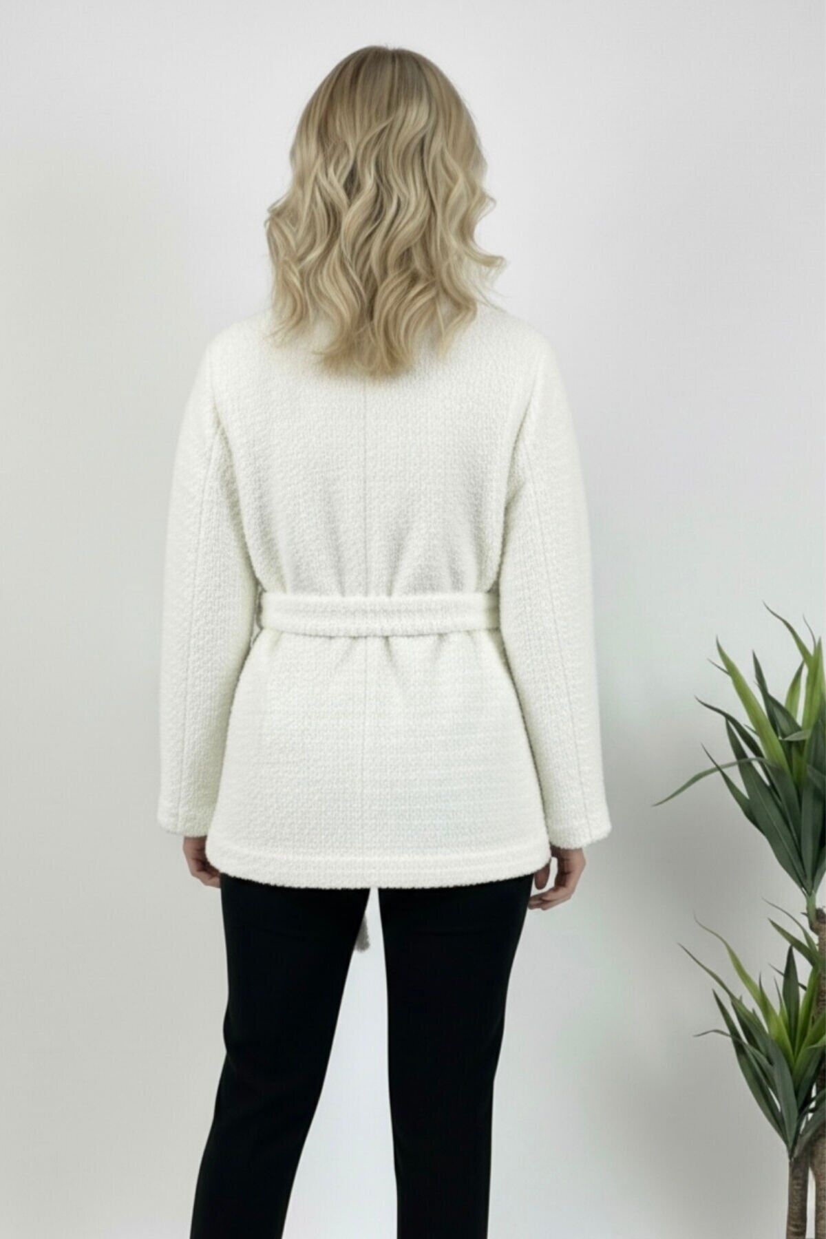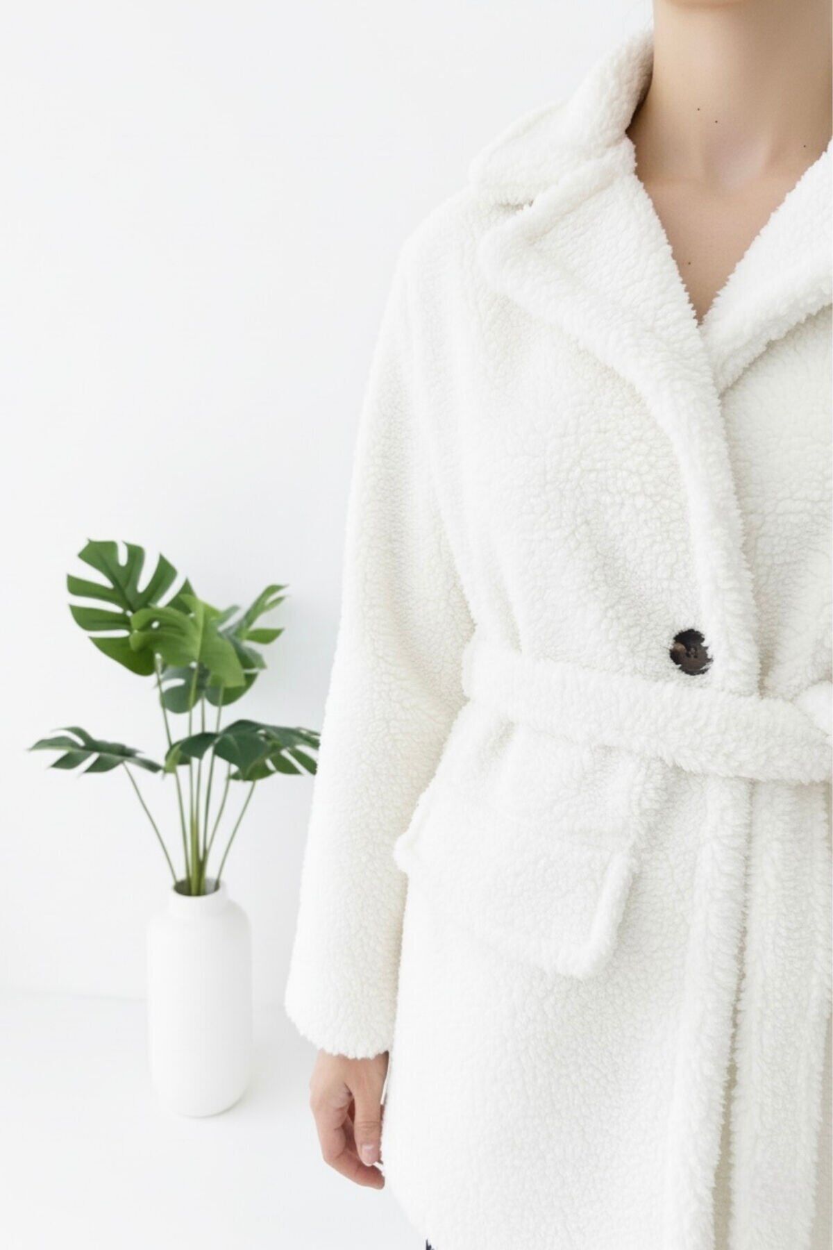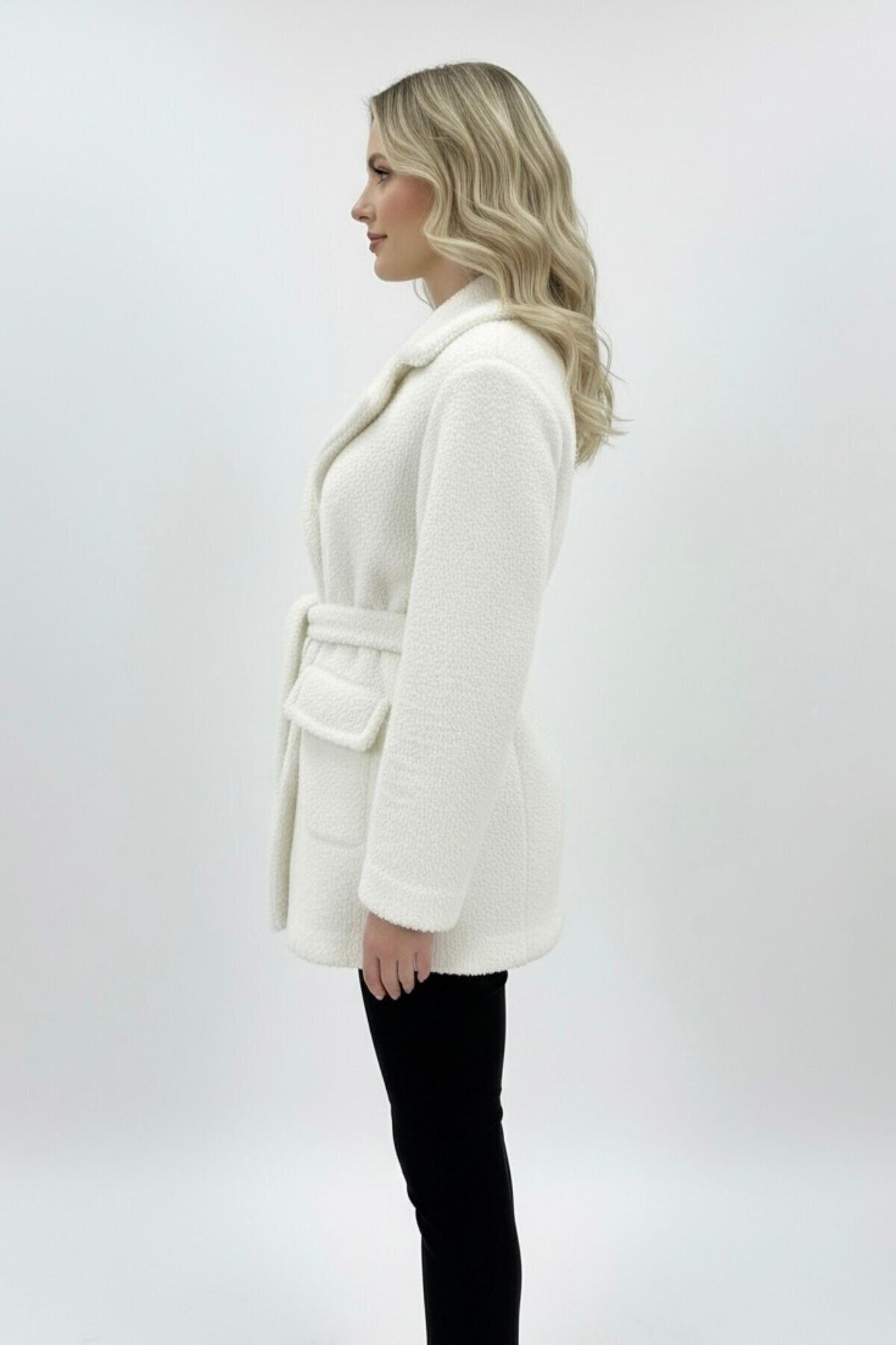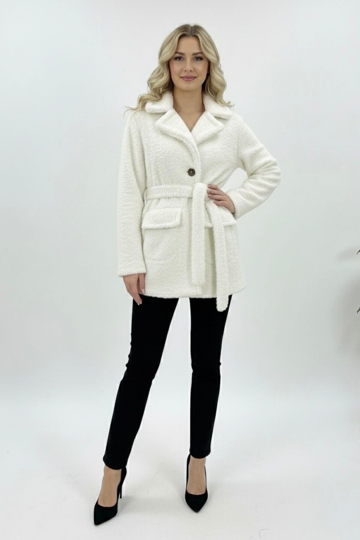 - Yeni sezonun trendlerini yansıtan peluş astarlı mont, kış aylarında sıcak tutarken şıklığınızdan ödün vermezsiniz.; - Regular kalıp ve normal boy kesimiyle rahat bir kullanım sunar, her türlü vücut tipine uyum sağlar.; - Örme kumaş yapısı sayesinde esneklik ve konforu bir arada yaşatır; hareket özgürlüğünüzü kısıtlamaz.; - Yetişkin kadınlar için ideal olan bu mont, casual tarzınıza sofistike bir dokunuş katar.; - Beyaz rengiyle dikkat çekici ve temiz bir görünüm sunar; kombinlerinizde kolayca yer bulur.; - Astarlı yapısı ile ekstra koruma sağlarken, peluş detaylarıyla yumuşak bir dokunuş hissi verir.; - 30 derecede tersten düşük ısıda yıkama imkanı sayesinde uzun süreli kullanım için idealdir.; - Ceket yaka tasarımı ile modern ve şık bir siluet oluştururken, düğmeli kapama şekli pratik kullanım sunar.; - Rüzgar geçirmez özelliğiyle soğuk havalarda bile sizi korur ve sıcak tutar.; - Dolgusuz yapısı hafifliğiyle konforlu bir deneyim sağlarken, kemer detaylarıyla belinizi zarifçe vurgular.; - Çift cepli tasarımının yanında peluş detayları da fonksiyonellik ve estetiği bir arada sunar.; -
