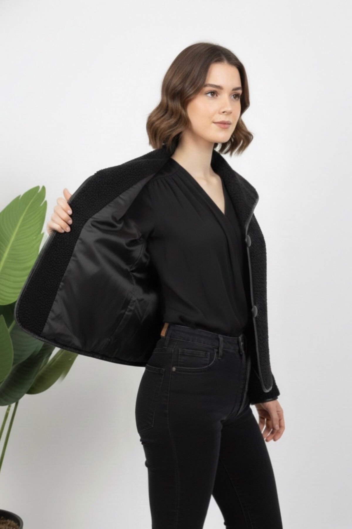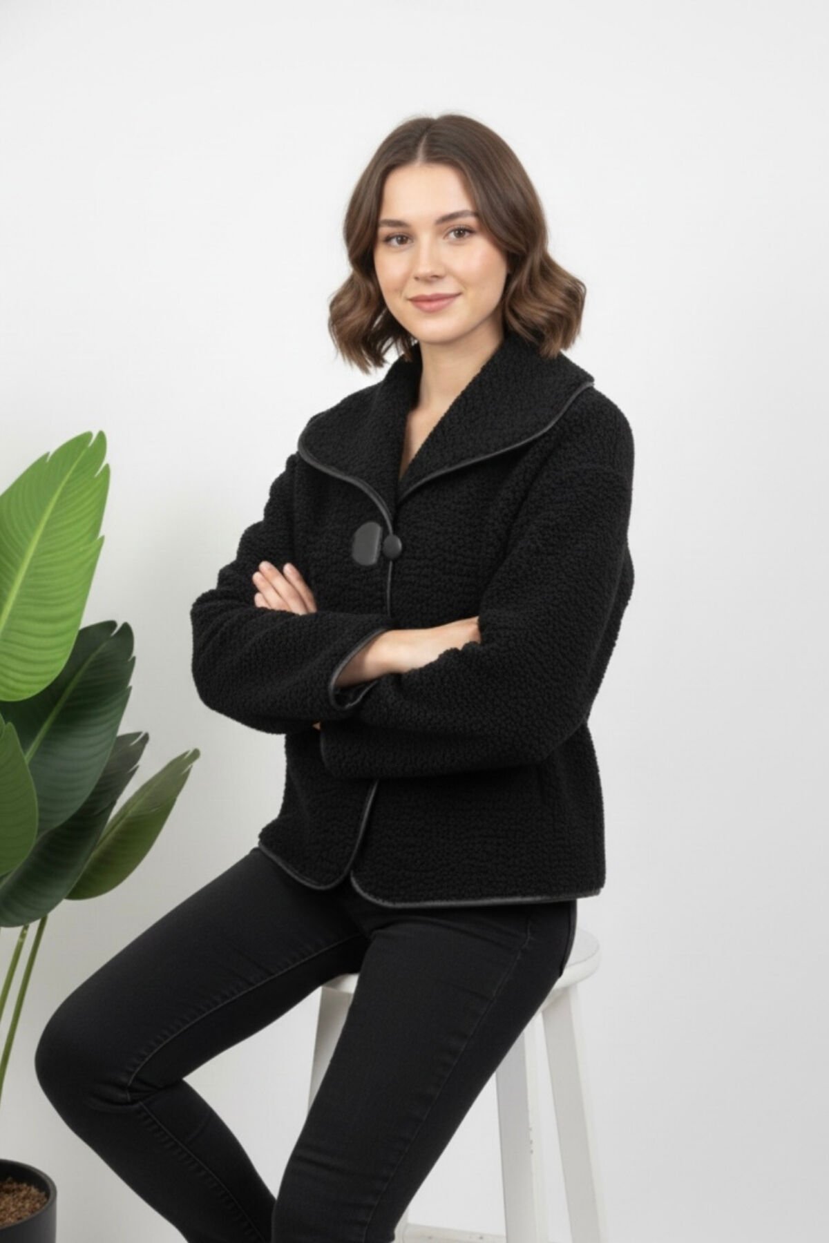 - Kış aylarında sıcak tutan peluş materyali ile konforlu bir kullanım sunar.; - Ceket yaka tasarımı ve düğmeli kapama şekliyle şık bir görünüm sağlar.; - Düz desen ve siyah renk seçeneği, kolay kombin yapma imkanı tanır.; - Uzun kollu ve astarlı yapısı ile soğuk havalarda ekstra koruma sağlar.; - Çift cepli tasarımı pratik kullanım sunarken, rüzgar geçirmez özelliği ile dış etkenlere karşı dayanıklılık gösterir.; - Regular kalıp ve dolgusuz yapısı sayesinde rahat bir oturuş ve hareket özgürlüğü sağlar.; - Casual / Günlük koleksiyonun parçası olarak her ortama uyum sağlayan şıklığıyla dikkat çeker.; - Kuru temizleme önerisi ile uzun ömürlü kullanım için idealdir.